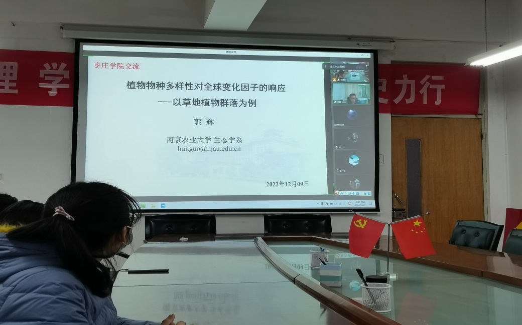 2022年12月9日下午,Beat365中文官方网站邀请南京农业大学生态学系主任、博士生导师郭辉教授作学术作题为《植物物种多样性对全球变化的响应:以草地植物群落为例》的学术报告。院长王满堂主持报告,学院全体专任教师及地理科学专业学生聆听了报告。