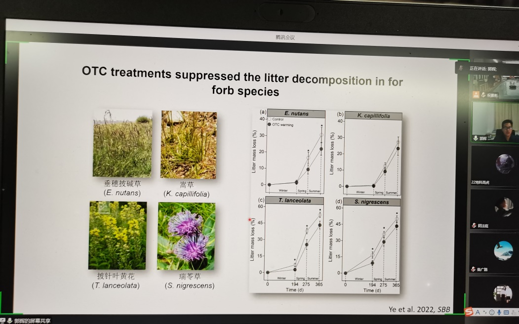 郭教授介绍了全球变化背景下有关植物物种多样性、生物量等研究的相关背景知识,介绍了在甘南藏族自治州国家高寒草地生态系统野外监测站设置的多因子试验的概况,着重分析了氮富集、增温和减雨对植被-土壤功能过程及其协同关系的影响,并且分析了该研究方向的科研热点和未来发展趋势,让学院师生对全球变化背景下植被物种多样性、生物量的变化特征及驱动机制有了更深的认识。