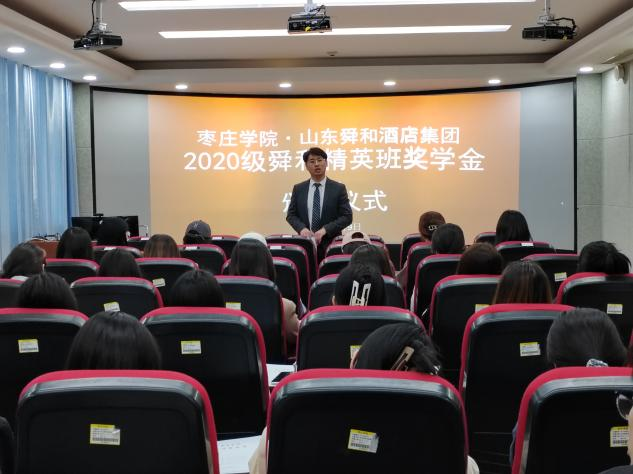 5月9日上午,2020级舜和精英班奖学金颁发仪式在综合楼1608教室举行。山东舜和酒店集团人才培训部经理刘康,Beat365中文官方网站党总支副书记韩建敏,旅游管理专业部分教师参加了颁发仪式。颁发仪式由酒店管理专业负责人王唯副教授主持。