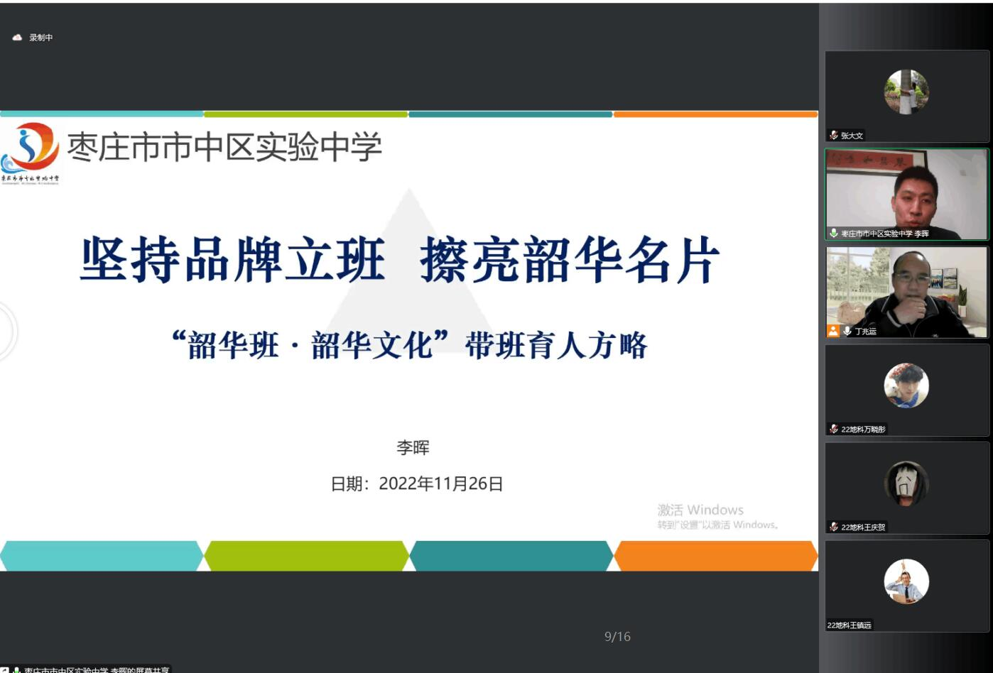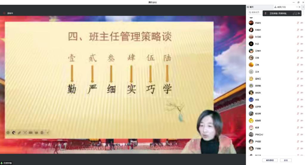 李晖老师分享了“韶华班·韶华文化”带班育人的方略,认为班主任工作中的理念是先“立德”后“树人”,走进学生内心,学会换位思考。以“韶华班”32字方针的班级建设核心理念:“外塑形象,内强素质;制度规范,民主气氛;活动凝聚,方法引领;精神锻造,灵魂点燃”为主线,分享了优秀的班级管理方法。从韶华班,到韶华年级的升华,集中体现了对班主任工作的卓越追求。