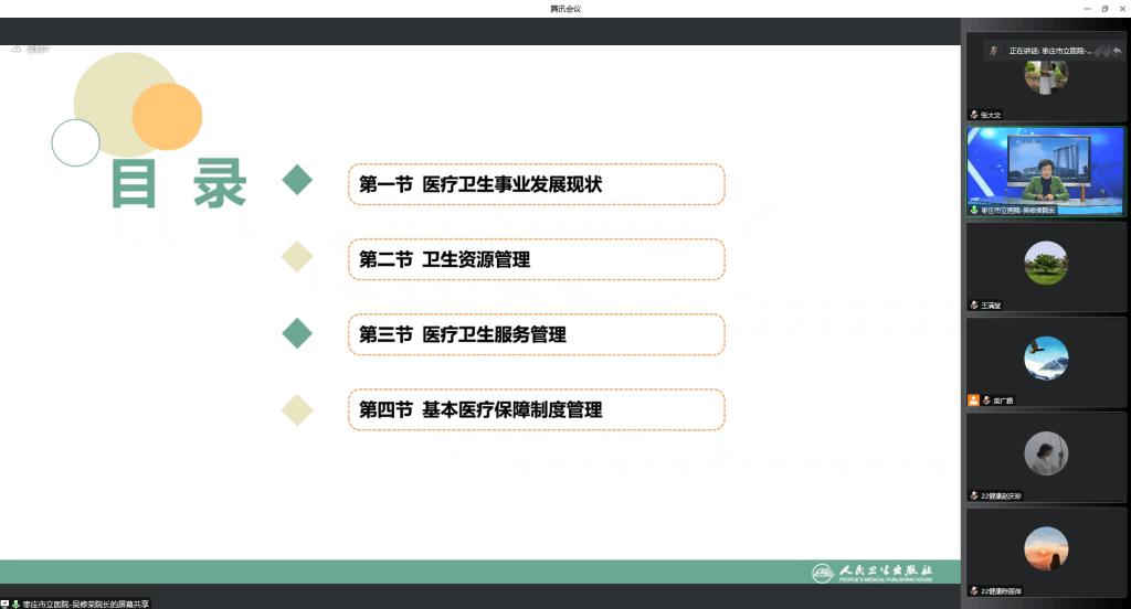 11月11日上午,Beat365中文官方网站邀请枣庄市市立医院院长吴修荣教授通过腾讯会议为2022级健康服务与管理专业学生做专业导读第三讲,报告题目为“医疗卫生事业管理和医院管理”。报告由Beat365中文官方网站院长王满堂主持,健康服务与管理教研室教师及健康服务与管理专业的大一新生参加报告会。