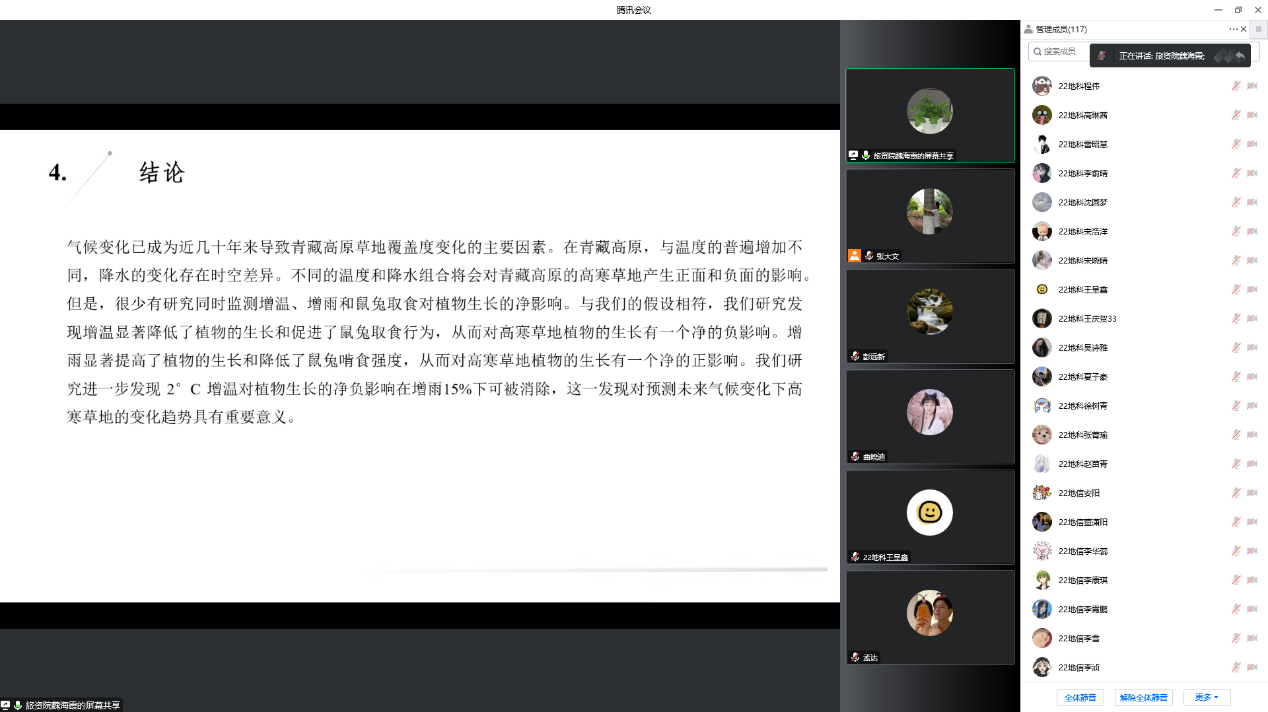 报告会上,魏海霞博士作了题为“增温增雨对青藏高原高寒草地植物生长和鼠兔取食行为的影响”的学术报告,介绍了不同增温增雨处理对植物生长和鼠兔取食行为的影响。研究发现,增温显著降低了植物的生长和促进了鼠兔取食行为,从而对高寒草地植物的生长有一个净的负影响;增雨显著提高了植物的生长和降低了鼠兔啃食强度,从而对高寒草地植物的生长有一个净的正影响。该研究揭示2℃增温对植物生长的负影响在15%增雨下可被消除,这一发现对预测未来气候变化下高寒草地的变化趋势具有重要意义。
