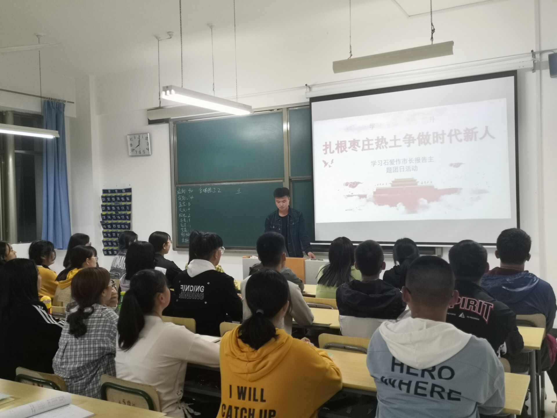 此次主题团日活动紧紧围绕石爱作市长所作的题为《不忘初心、砥砺前行——加速推动资源型城市高质量发展》的形势政策报告进行。各班团支部创新活动形式,通过讲解枣庄精神,观看枣庄发展视频、 “聊聊我枣庄”为切入点,进一步提升对枣庄的认识,激发广大团员青年的责任感和使命感,树立扎根枣庄的理想信念。同时,青年团员对如何扎根枣庄热土,如何创新创业,如何练就过硬本领、争做时代新人进行充分讨论和交流。大家纷纷表示将以实际行动贯彻落实石爱作市长报告精神,不忘初心、砥砺前行,用拼搏点亮青春,用奋斗成就梦想,练就过硬本领,扎根枣庄热土,为枣庄的发展贡献自己的力量。
