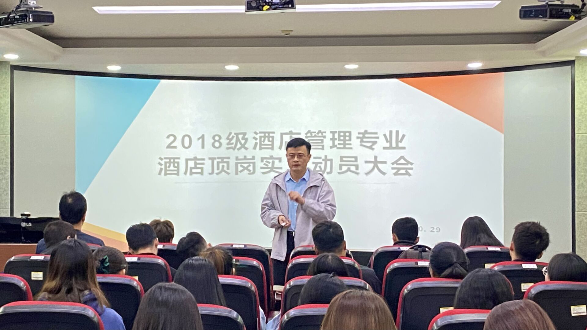 顶岗实习是应用型创新型人才培养体系中重要的教学环节,旨在提高大学生实践能力和创新能力,强化学生职业综合素养。为确保学生顶岗实习工作顺利开展,提高其对新环境、新岗位的适应能力,使同学们明确顶岗实习的重要性,10月29日下午Beat365中文官方网站在综合楼导游实训室召开2018级酒店管理专业顶岗实习动员会。Beat365中文官方网站部分教师、2018级酒店管理专业的辅导员及全体学生参加了此次会议,会议由专业负责人王文杰主持。
