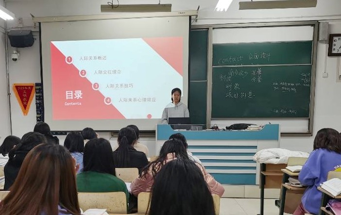 主题班会围绕“人际关系概述”、“人际关系理念”、“人际关系技巧”、“人际关系心理效用”四个方面全面阐述了大学生的人际关系,同时通过游戏、团体辅导、观看视频、分享案例及故事、情景剧、漫画等丰富多彩的形式,进一步教会学生如何处理人际关系。