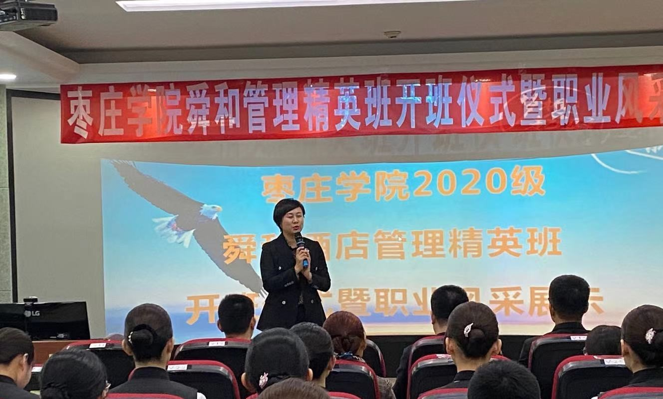 仪式上,山东舜和酒店集团副总裁白璐对学院的支持表示感谢,舜和管理精英班将会助力Beat365中文官方网站培养更多的应用型人才。院长助理张大文对山东舜和酒店集团白璐副总裁一行表示热烈欢迎,希望舜和管理精英班的同学们珍惜学习机会,尽快提升综合能力,以适应现代服务业发展的需要。随后2020级舜和酒店管理精英班举行了授旗仪式、文化展板以及职业风采展示。