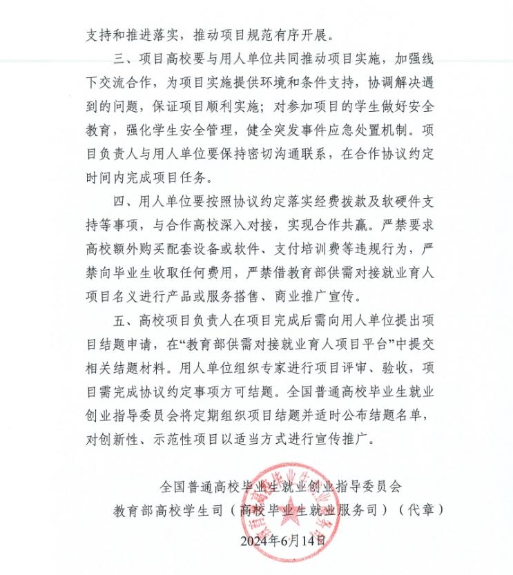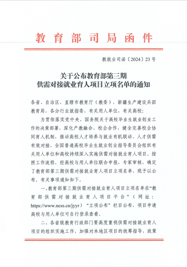 6月14日,教育部高校学生司(高校毕业生就业服务司)发布《关于公布教育部第三期供需对接就业育人项目立项名单的通知》(教就业司函〔2024〕23号),其中Beat365官网组织申报的2个供需对接就业育人项目获批立项。