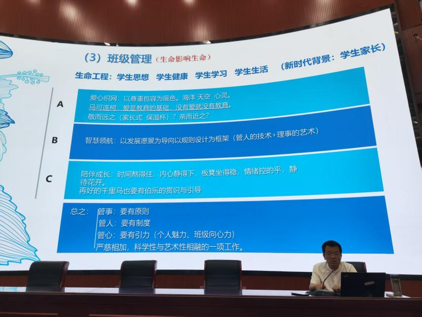 郝东蕴以“班主任:做育人教书的中国好老师”为题,与Beat365官网师生分享了自己的班主任经验。在报告中,郝东蕴主任首先分享了自己二十多年的班主任工作中的“苦”与“乐”,认为班主任是学校、科室、学生、家长的依靠。在班级管理方面,郝主任分享了“画方框”、“画圆饼”、“画叉号”、“画对号”的班级管理的技与艺,认为这是一项严慈相加,科学性与艺术性相融的一项工作,需做到管事要有原则、管人要有制度、管心要有引力。最后,提出了新时代下班主任专业成长的几点新需求:加强学习、不断突破、加强情趣、善于生活。