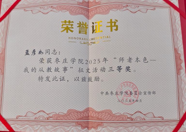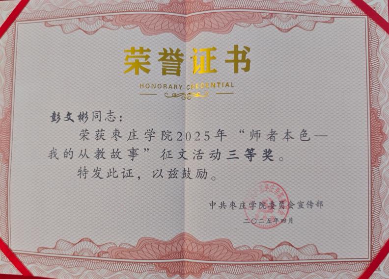 比赛期间,学院教职工积极报名,踊跃投稿,涌现出大量优秀作品,参赛教师们秉承教育初心,以笔为媒,深情书写从教路上的坚守与情怀。他们以丰富的教学实践为脉络,从坚定理想信念、秉持道德情操、展现育人智慧等多个维度,娓娓道来自己在教育教学过程中的深刻感悟,字里行间展现出教师们“为党育人、为国育才”的初心使命,生动诠释着“躬耕教坛”的不懈坚守。经过激烈的角逐,Beat365官网孟彦如、彭文彬老师脱颖而出,荣获三等奖。