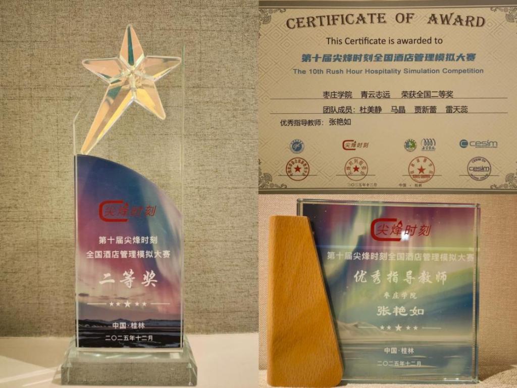 12月5日-7日,第十届“尖峰时刻”全国酒店管理模拟大赛总决赛在桂林旅游学院圆满落幕。2023级酒店管理专业学生杜美静、贾新蕾、马晶、雷天蕊组成的参赛团队(指导教师:张艳如),首次斩获全国二等奖。