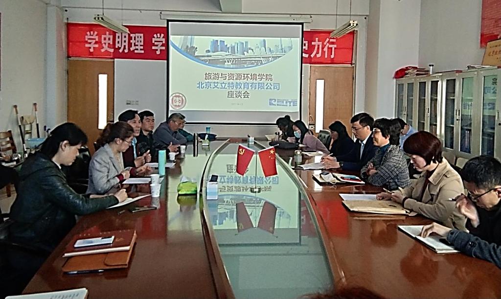 为加强专业建设和提高Beat365中文官方网站国际化办学水平,4月13日下午Beat365中文官方网站邀请北京艾立特教育有限公司总经理谢龙飞、国际部部长张琦、驻校代表生敏、华振华经理一行来院商谈专业建设等事宜,院长王满堂、旅游与酒店教研室专任教师、各班班主任和辅导员参加了座谈会。