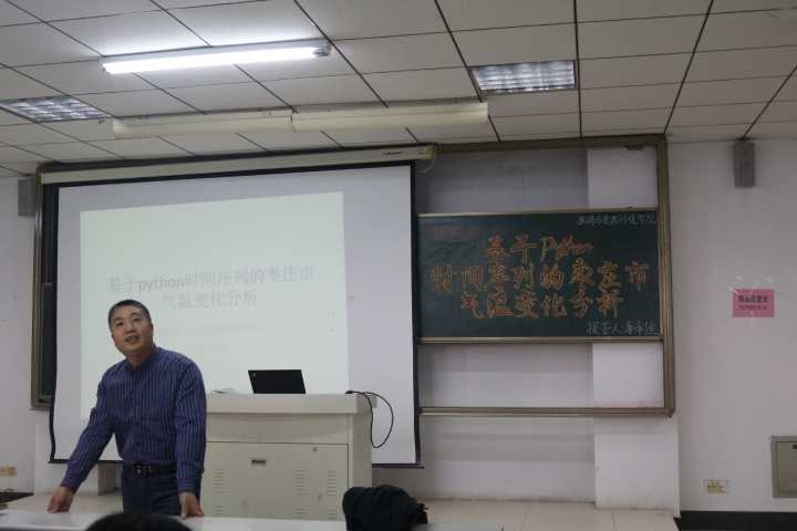 报告会伊始,唐承佳副教授为同学们介绍了时间序列有关基本知识及其在地理学研究中的最新实践应用,随后为同学们讲解了Python 以及Python 语言的应用前景,并结合搜集的近千余年枣庄的气温数据,演示了运用Python对枣庄未来的气温变化进行预测的方法步骤,最后据此归纳总结出枣庄气温、降水的变化特点。唐老师讲完后,同学们纷纷与唐老师进行交流,唐老师就同学们提出的问题逐一进行耐心地解答。