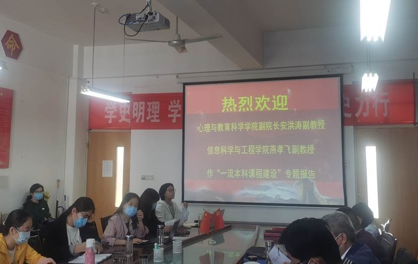 课程建设是有效落实教学计划,深化教学改革,变革教学方式和管理方式,提升教学水平和人才培养质量的重要抓手。为进一步理清一流课程建设思路,提高一流课程建设成效,4月27日下午在理工楼2514会议室,Beat365中文官方网站邀请信息科学与工程学院燕孝飞副教授、心理与教育科学学院副院长安洪涛副教授作一流课程建设专题报告。学院全体专任教师参加了此次专题报告会,报告会由副院长张大文主持。