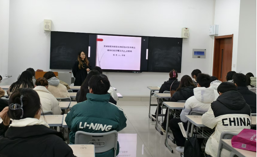 在报告会议上,李菁博士就“氮磷施肥和铁氧化物添加对杉木林土壤有机碳分解及其Q10的影响”进行了学术报告。李菁博士以我国南方面积最大的杉木人工林的土壤为研究对象,依托野外长期施氮磷肥控制试验,采用土壤团聚体分级、13C同位素技术等实验方法,结合室内添加葡萄糖、铁氧化物(水铁矿、针铁矿),并设置不同含水量条件60%田间持水量(WHC)和100% WHC,置于不同温度下进行室内模拟培养实验,测定土壤化学性质、微生物群落、酶活性,探究施肥和铁氧化物添加对SOC分解及其Q10的影响机制。研究发现施氮磷肥没有影响杉木人工林全土有机碳的分解,但显著影响不同粒径团聚体有机碳的分解;不同晶型的铁氧化物对SOC分解的影响不同,水铁矿添加抑制杉木人工林SOC分解,针铁矿没有此种抑制作用;铁氧化物添加对SOC分解的影响与土壤碳有效性有关,添加葡萄糖使针铁矿促进SOC分解;在添加水铁矿的处理中,含水量的提高能改变单施氮肥对SOC分解的抑制作用。