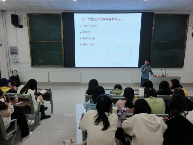 邵园园从“爱情到底是什么”“爱情需要什么”和“怎样去达到一个较好的爱情状态”三个问题展开论述,诠释爱情的真谛,帮助同学们提升爱与被爱的能力。随后,邵园园结合具体实例,聚焦当下女大学生在恋爱过程中常遭遇的心理挑战和安全问题,引导同学们正确认识自身情感需求,学会理性处理恋爱矛盾,并强调在恋爱观上应注重道德修养和精神追求,确保恋爱关系的纯洁、稳定与高尚。同时,邵园园围绕出行、住宿、兼职等多个方面指出并分析女生在安全防范中存在的不足以及应对方法,有助于加强同学们的安全防范意识、提高其风险应变能力。最后,邵园园指出“爱情不是生活的全部,爱自己才是终身浪漫的开始”,希望同学们在大学期间正确处理好恋爱、学习与生活的关系,塑造更好的自己。