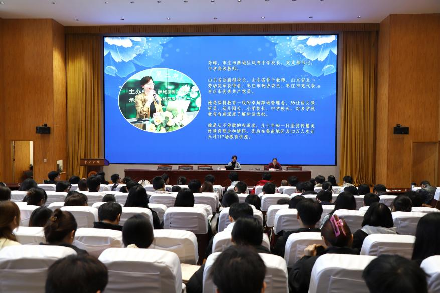 孙烨校长是深耕教育一线的卓越跨域管理者,历任语文教研员、幼儿园长、小学校长、中学校长,对多学段教育有着深度了解和话语权。她也是从不停歇的布道者,几十年如一日坚持传播美好教育理念和情怀,先后在鲁南地区为12万人次开办过117场教育讲座。孙烨校长以“做教师,你准备好了吗?”为题,深入浅出、生动有趣地阐述了“何为教育、何为学校、何为教师”。教育的本质是唤醒和点燃,一万次的知识灌输,不如一场真正的唤醒。师生关系是学校空间中最重要的要素,也是对学生影响最重要的要素,只有良好的师生关系才蕴藏着教育的力量,甚至就是教育本身。最后通过一段公益广告和北大校长讲话片段,点出教师是用一个生命点燃另一个生命,是释迦牟尼说的“师长应以五事敬事弟子”。