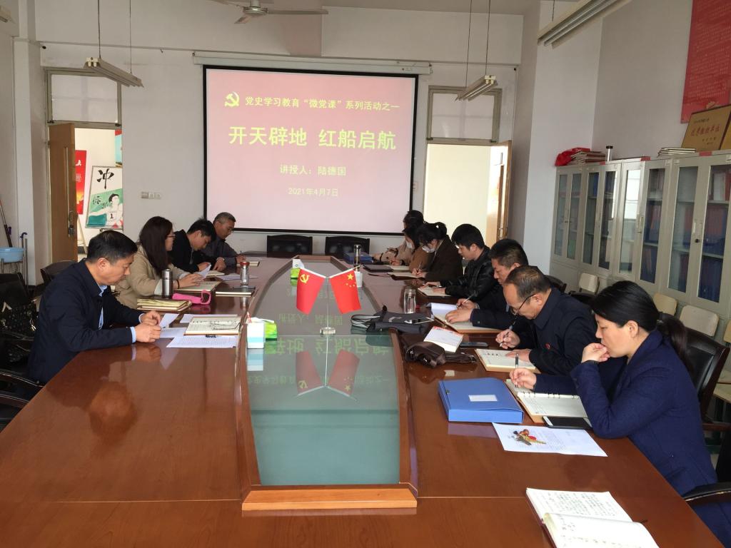 4月7日下午,Beat365中文官方网站党总支教工第一党支部在党员活动室开展学党史“微党课”活动。第一讲由学院党总支书记陆德国以《开天辟地、红船启航》为题,从“一大”的历史背景、成立的经过及历史意义等方面逐条讲述。