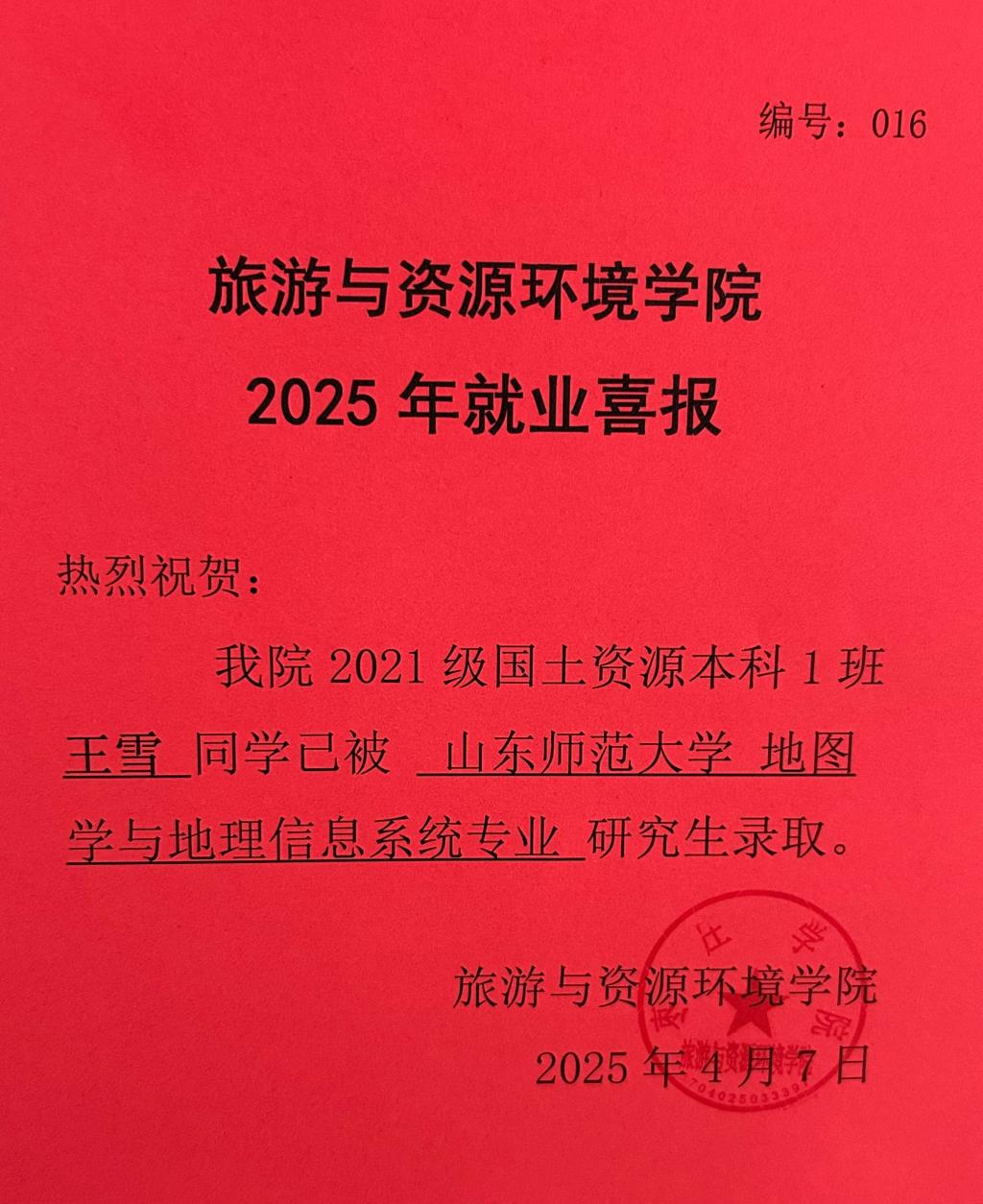 喜报!21国土资源本科1班王雪被山东师范大学录取!