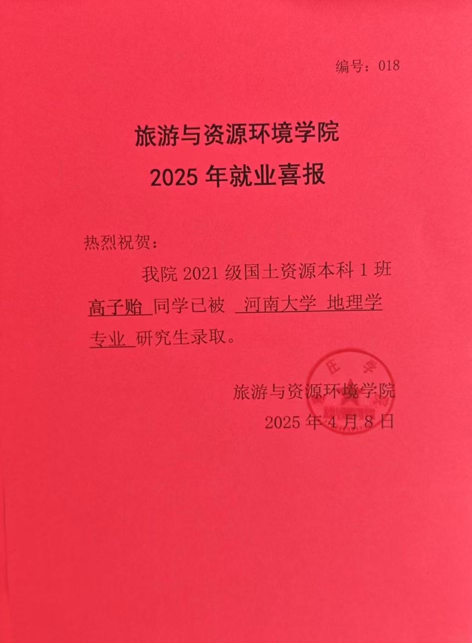 喜报!21国土资源本科1班高子贻被河南大学录取!