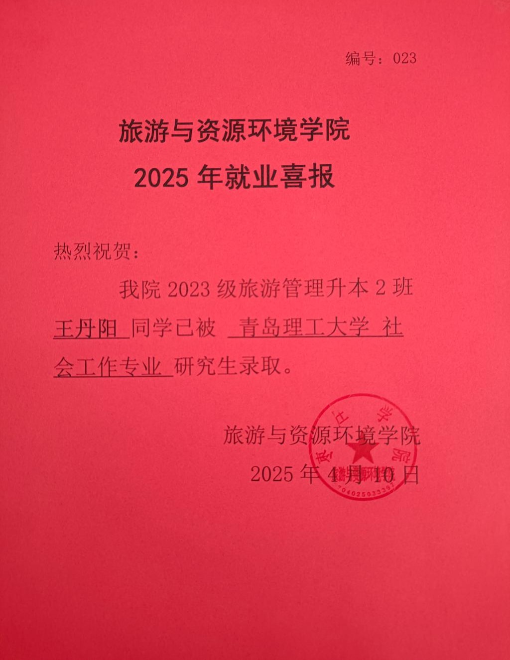 喜报!23旅游管理升本2班王丹阳被青岛理工大学录取!