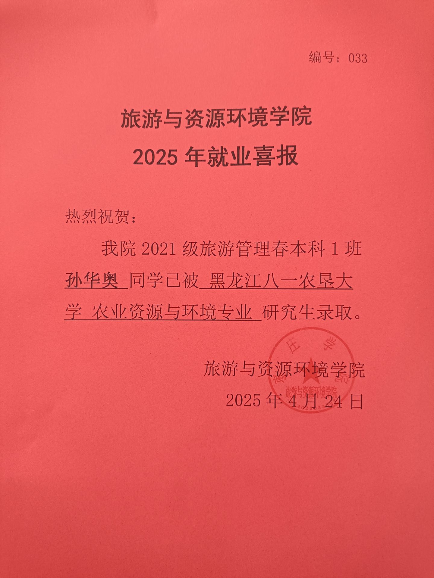 喜报!21旅游管理春本科1班孙华奥被黑龙江八一农垦大学录取!